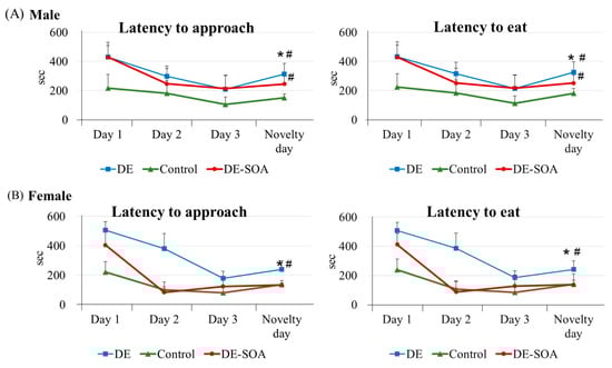 Novelty-induced hypophagia test. Latency to approach and latency to eat in 10-week-old (A) male and (B) female rats of the control and the DE- or DE-SOA-exposed groups (n = 10, * p < 0.05 vs. corresponding Day 3 and # p < 0.05 vs. corresponding control group on novelty day).