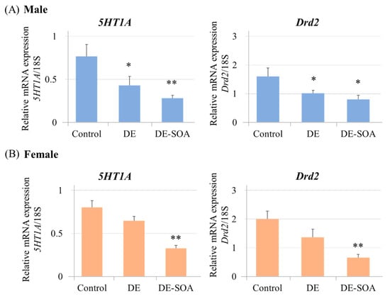 Messenger RNA expression levels of neurotransmitters in the hippocampus. Serotonin receptor (5HT1A) and dopamine receptor (Drd2) in the hippocampus of 10-week-old (A) male and (B) female rats of the control and the DE- or DE-SOA-exposed groups. (n = 10, ** p < 0.01, * p < 0.05 vs. control).