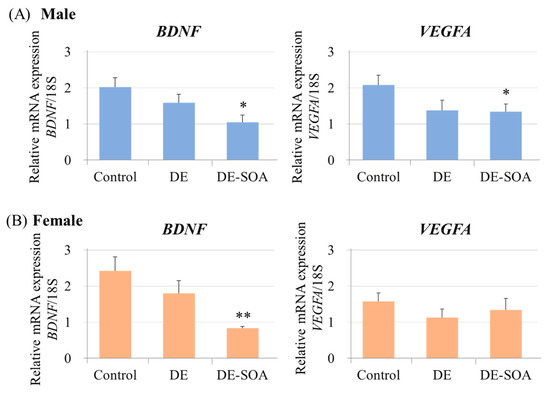 Messenger RNA expression levels of neurotrophins in the hippocampus. BDNF and VEGFA in the hippocampus of 10-week-old (A) male and (B) female rats of the control and the DE- or DE-SOA-exposed groups. (n = 10, ** p < 0.01, * p < 0.05 vs. control).