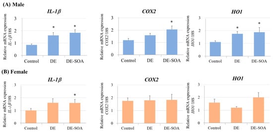 Messenger RNA expression levels of inflammatory and oxidative stress markers in the hippocampus. IL-1β, COX2 and HO1 mRNAs in the hippocampus of 10-week-old (A) male and (B) female rats of the control and the DE- or DE-SOA-exposed groups. (n = 10, * p < 0.05 vs. control).