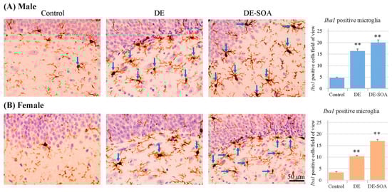 Representative photomicrographs of the dentate gyrus of the hippocampus. Microglia marker Iba1 immunoreactivity in 10-week-old (A) male and (B) female rats of the control and the DE- or DE-SOA-exposed groups. Blue arrows indicate activated microglia. (Scale bar = 50 μm). Number of Iba1-positive cells located within the DG area of the hippocampus was quantified in a high-power field under microscopy (histogram). (n = 5, ** p < 0.01 vs. control).