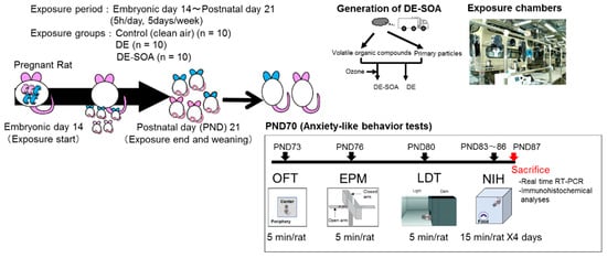 Twenty-four pregnant Sprague Dawley rats (gestational day (GD) 8) were purchased from Oriental Yeast Co., Ltd. (Tokyo, Japan) and exposed to clean air (control, n = 8), DE (n = 8), and DE-SOA (n = 8) from GD 14 to postnatal day (PND) 21 in whole-body exposure chambers. Food and water were given ad libitum. Date of birth was recorded as PND 0 and the offspring were housed in cages with dams under controlled environmental conditions (temperature, 22 ± 0.5 °C; humidity, 50 ± 5%; lights on 07:00–19:00 h). The pregnant rats were exposed clean air, DE or DE-SOA for 5 h per day (from 10:00 p.m. to 3:00 a.m.), 5 days a week excluding weekends from gestational day 14 to postnatal day 21 with their pups (Figure 10). The numbers of pups born were 253 (116 male and 137 female) in the control, 130 (68 male and 62 female) in the DE group, and 135 (63 male and 72 female) in the DE-SOA group. We used 3 male and 3 female pups from each dam (total 72 male and 72 female pups). Among them, 10 male and 10 female rats from 3 groups (total 60) were used for the anxiety-like behavior tests, and 5 male and 5 female rats from 3 groups (total 15) were used for immunohistochemical analyses.