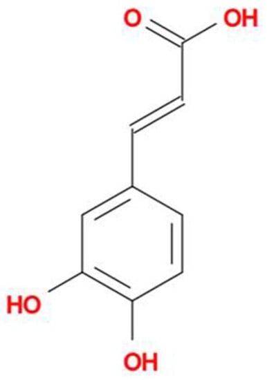 When we drink coffee (even the one without caffeine) or red wine, we consume a molecule with highly diverse and interesting effects on our health: a natural polyphenolic compound called caffeic acid. A heavy coffee drinker can consume up to 500 mg of caffeic acid per day; people who do not drink coffee consume up to 25 mg of caffeic acid [1]. However, coffees (and red wine) are not the only sources of caffeic acid in our diet. Many other plant products contain caffeic acid, including apples, plums, lingonberries, black chokeberries, and many herbs of the mint family, e.g., sage, thyme, oregano, marjoram, oregano, or spearmint [1]. Black chokeberries seem to be the most potent source of caffeic acid (645 mg/100 g of dry weight). In comparison, the caffeic acid content in coffee ranges from 9 to 14 mg/100 g [2] or up to 87 mg/100 g, according to [1]. Other sources of caffeic acid are its naturally occurring esters: chlorogenic acid [3], rosmarinic acid [4], and caffeic acid phenethyl ester [5].
