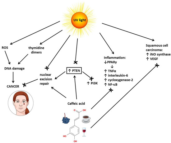 Caffeic acid protects the skin against cancer on multiple fronts (Figure 2). In the skin, UV light forms ROS that can break the sugar–phosphate spine of DNA [29]. By scavenging ROS, caffeic acid protects DNA against breakage [37]. UV light also forms thymidine dimers in the DNA strand; to repair thymidine dimers, the cell employs a repairing mechanism called nuclear excision repair [29]. In human dermal fibroblasts and mouse skin, caffeic acid (40 μM) prevented the UVB-induced the loss of proteins necessary for nuclear excision repair: xeroderma pigmentosum protein C (XPC), general transcription factor IIH subunit (TFIIH-p44), xeroderma pigmentosum protein A (XPA), and excision repair cross-complementation group 1 (ERCC1), as well as the loss of PTEN [37]. PTEN inhibits the PI3K/Akt signaling pathway, which is often constitutively active in skin cancer cells due to mutations. Additionally, PTEN is necessary for nuclear excision repair [38]. In Swiss albino mice, the pretreatment with caffeic acid (15 mg/kg) prevented UVB light-induced inflammation. Caffeic acid decreased tumor necrosis factor alpha (TNF-α), interleukin-6 (IL-6), cyclooxygenase-2 (COX-2), and NF-κB levels in the exposed mice, possibly by inhibiting the expression of peroxisome proliferator-activated receptor gamma (PPARγ) [39].