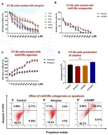 Effect of atropine and 4-DAMP on proliferation, apoptosis, and production of choline in CT-26 cells. CT-26 cells were treated with different concentrations of atropine at different time points (A). Number of viable cells after 8 h incubation with various concentrations of atropine and 4-DAMP (B). CT-26 cells were treated with various concentrations of carbachol and donepezil for 8 h (C). The amount of choline was measured in CT-26 cells treated with atropine, 4-DAMP, and donepezil (D). Annexin V-FITC/PI staining of CT-26 murine colon cancer cell line treated with control (E), atropine (E’), and 4-DAMP (E”). Values in (A–E) are mean ± standard error of the mean (SEM) from at least three independent experiments performed in triplicate wells. Two independent experiments were performed in triplicates. Values presented as mean ± SEM from at least two independent experiments for choline assay. Two-way ANOVA followed by Tukey’s multiple comparison test was used and considered significant when * p < 0.05.