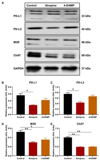 To determine whether atropine and 4-DAMP can influence the expression of PD-L1 and PD-L2, CT-26 cells were pre-treated with 100 µM atropine and 4-DAMP for 8 h prior to protein expression via Western blot staining. Atropine significantly decreased the expression of PD-L1 compared to the control (Figure 2A,B). Similarly, atropine attenuated PD-L2 expression compared to the control (Figure 2A,C). However, specific blocking of M3R with 4-DAMP did not affect CT-26 expression of PD-L1 and PD-L2 (Figure 2A–C).