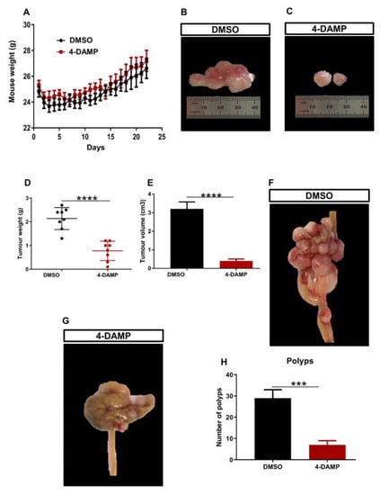 Effect of 4-DAMP on tumor growth in vivo. Body weight of mice treated with a vehicle (0.1% DMSO) and 4-DAMP (10 mg/kg daily) (A). Images of tumor size from DMSO-treated group (B) and 4-DAMP-treated group (C). Bar graphs displaying the mean weight (D) and volume (E) of tumors collected from DMSO and 4-DAMP-treated groups. The caecum samples were removed from tumor-bearing mice treated with DMSO (F) and 4-DAMP (G). Bar graph displaying the mean number of tumor polyps from DMSO and 4-DAMP-treated groups (H). Data presented as mean ± SEM, n = 8 mice per group. Student’s t-test, *** p < 0.001, **** p < 0.0001.