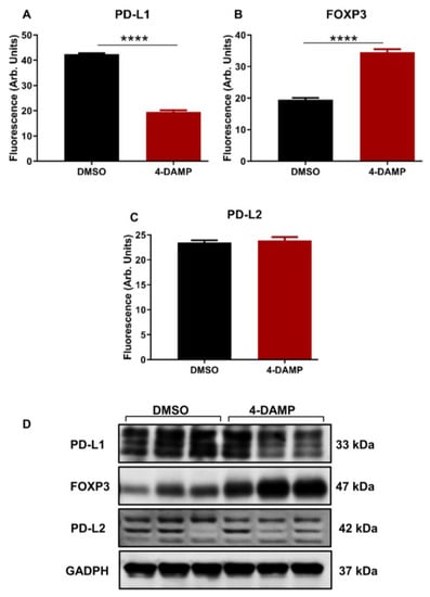 In addition, the expression of PD-L2 was also evaluated. Although PD-L2 has a similar function to that of PD-L1, no significant difference was noted between the expression of PD-L2 in tumors from 4-DAMP-treated and DMSO-treated mice (Figure 5C,D, Figures S2A–A” and S2B–B”, ∆: 0.38.88 ± 0.82, p = 0.6553). These findings were further confirmed by Western blot. The results obtained from in vitro model demonstrated that 4-DAMP attenuated PD-L2; however, this was not confirmed in vivo. These findings reinforced the influence of the tumor microenvironment on the expression of immunosuppressive markers.
