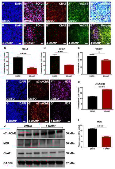 Tumor tissues collected from vehicle-treated and 4-DAMP-treated groups were fixed with Zamboni’s fixative overnight at 4 °C. The next day, the fixative was cleared off by washing samples for 10 min three times with DMSO (Sigma-Aldrich, Macquarie Park, NSW, Australia), followed by three times 10 min wash with phosphate-buffered saline (PBS). Tissues were then embedded in an optimum cutting temperature medium (OCT) and frozen using 2-methyl butane (isopentane) and liquid nitrogen. Samples were stored in a −80 °C freezer until cryo-sectioned. Tissues were cut at 10 μm section thickness using a Leica CM1950 cryostat (Leica Biosystems, Nussloch, Germany), adhered to slides, and allowed to dry at room temperature for 1 h before commencing the staining process. OCT was washed off with PBS containing 0.01% Triton X-100 (PBST) for 5 min. Samples were outlined using a liquid Blocker Super Pap Pen to reduce the volume of antibodies used. The endogenous activity was blocked using 10% normal donkey serum for 1 h at room temperature, followed by PBST washes. Samples were then incubated with 1:500 dilution of primary antibodies [mouse monoclonal to PD-L1 (Abcam, ab210931), rabbit polyclonal to PD-L2 (Abcam, ab200377), rabbit polyclonal to M3R (Abcam, ab126168), mouse monoclonal to α7nAChR (Novus, Centennial, CO, USA, 7F10G1), goat polyclonal to ChAT (Abcam, ab134021), sheep polyclonal to VAChT (Abcam, ab31544), mouse monoclonal to FOXP3 (Abcam, ab20034), rabbit polyclonal to VEGF (Abcam, ab46154), rat monoclonal to CD31 (Abcam, ab7388) and rabbit polyclonal to TGF-β (Abcam, ab155264)] overnight at 4 °C. Sections were then washed in PBST before incubation with 1:250 dilution of secondary antibodies labeled against primary antibodies [Alexa Fluor 488-conjugated donkey anti-goat, anti-sheep, and anti-rat (Abacus, Morningside, QLD, Australia, JI705-545-003), Alexa Fluor 594-conjugated donkey anti-rabbit (Abacus, JI711585152) and Alexa Fluor 647-conjugated donkey anti-mouse (Abacus, JI715605150)] for 2 h at room temperature in the dark, followed by PBST washes. The sections were incubated with 4′,6-diamidine-2′-phenylindole dihydrochloride (DAPI) (D1306, Life Technologies, Mulgrave, VIC, Australia) for 1 min. Sections were given final washes in PBST and then mounted with DAKO mounting media (Agilent Technologies, Mulgrave, VIC, Australia). Coverslips were placed over each section and left to dry overnight before imaging. Sections were viewed under a Nikon Eclipse Ti laser scanning confocal microscope (Nikon, Tokyo, Japan), whereby eight randomly chosen images from each sample were captured with a 40× objective and analyzed using image analysis software (Nikon, Japan).