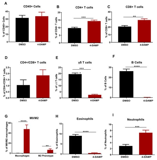 Flow cytometric analysis of CD45+ cells and T lymphocytes. Proportion of the CD45+ cells (A), CD4+ T cells (B), CD8+ T cells (C), CD4+/CD8+ T cells ratio (D), γδ T cells (E), B cells (F), eosinophils (G), macrophages (H) and neutrophils (I) in tumors from DMSO-treated and 4-DAMP-treated groups. Data presented as mean ± SEM, DMSO-treated (n = 4), 4-DAMP-treated (n = 7) mice per group. Student’s t-test, ** p < 0.01, *** p < 0.001, **** p < 0.0001.