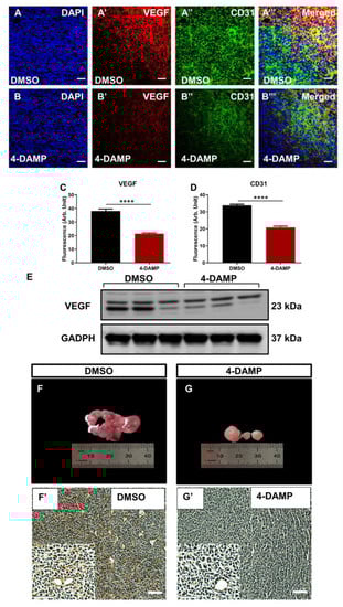 Effect of 4-DAMP treatment on the expression of VEGF and CD31 in vivo. VEGF and CD31 expression in tumor samples from mice bearing CT-26 cell-induced CRC treated with DMSO (A–A’’’) and 4-DAMP (B–B’’’). Tumors were labeled with the nuclei marker DAPI (blue; A,B), VEGF (red; A’,B’), CD31 (green; A’’,B’’), and all markers merged (yellow; A’’’,B’’’). The scale bar represents 50 µm. Bar graphs displaying the mean fluorescence level of VEGF (C), CD31 (D), and image of VEGF Western blot bands (E) in tumor samples from DMSO-treated and 4-DAMP-treated mice. Image showing blood vessels and intensity of CD31 in tumor samples from mice bearing CT-26 cell-induced tumors treated with DMSO (F,F’) and 4-DAMP (G,G’). The scale bar represents 100 µm. Data presented as mean ± SEM, n = 8 per group. Student’s t-test, **** p < 0.0001.
