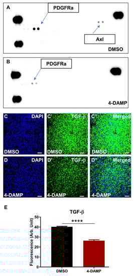 In addition, tyrosine kinases in tumor tissue lysates were evaluated using a mouse Phospho-RTK Array. Tumor samples from each group were pooled, and the expression level of kinases was measured. The results showed that the DMSO group overexpressed platelet-derived growth factor receptor α (PDGFRα) and Axl tyrosine kinases (Figure 9A), both involved in cancer cell proliferation, invasion angiogenesis, and migration. Treatment with 4-DAMP significantly reduced expression levels of PDGFRα and abolished Axl (Figure 9B). Although TGF-β is not a marker for tumor angiogenesis per se, studies have demonstrated a strong association between tumor expression of TGF-β and tumor angiogenesis [44,45]. Administration of 4-DAMP significantly reduced TGF-β expression compared to DMSO treatment (Figure 9C–E, ∆: −13.85 ± 1.03, p < 0.0001). Taken together, these findings reinforced the important role of ACh in tumor angiogenesis, and M3 receptors could be a potential therapeutic target for the inhibition of angiogenesis.