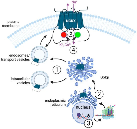 Different NCKX genes are expressed, and their protein products reside, in different cells and tissues, thus linking them to different physiological processes such as rod photoreceptor signaling (NCKX1), olfactory sensory neuron signaling (NCKX4), or skin melanocyte maturation (NCKX5). Nevertheless, there is no clear indication that the different NCKX proteins display distinct functional properties tailored to these different cellular environments and processes [9,10]. Perhaps a notable exception to this general fact is subcellular location, which varies among the different NCKX proteins.