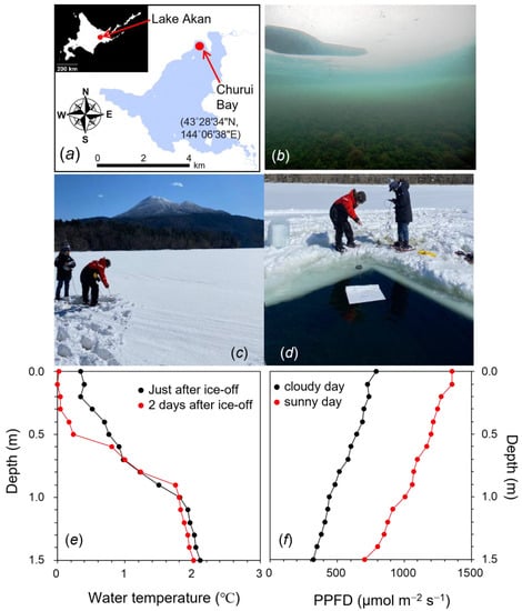 (a) Sampling location in Lake Akan, Hokkaido, Japan. (b) Marimo in Lake Akan. (c) Ice on the surface of Lake Akan in the winter. (d) Cutting out a part of the ice of the lake. (e) Vertical profile of the water temperature just after the ice-off (black) and two days after the ice-off (red). (f) Vertical profile of PPFD under the lake without the ice on cloudy (black) and sunny days (red). Measurements were conducted on a clear day in March. Ice thickness was about 50 cm.