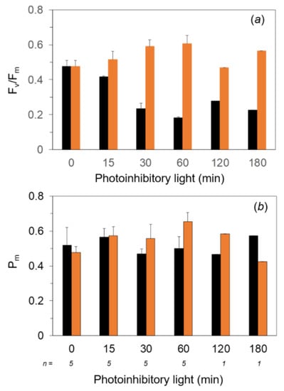 Fv/Fm (a) and Pm (b) after the exposure to strong light and the subsequent moderate light at low temperatures in the filamentous cells dissected from the spherical marimo. Dark-treated filamentous cells were exposed to the white light at 800 μmol m−2 s−1 for up to 180 min at 2 °C on ice. After the high light for each given time, the filamentous cells were dark-treated for 30 min, and Fv/Fm and Pm were measured at 4 °C (black bar). The photoinhibited filamentous cells at each illuminating time were irradiated by the white light at 250 μmol m−2 s−1 used as the repair light for 30 min at 2 °C on ice, and then Fv/Fm and Pm were measured at 4 °C after the dark treatment for 30 min (orange bar). Measurements were taken in the cold room (40 Pa CO2, 21 kPa O2, at 4 °C). The values represent the means ± SD (n = 1–5).