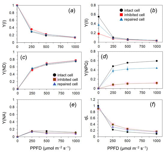 The redox states of PSI showed no significant differences by PSII photoinhibition: Y(I) was decreased with the PPFD levels, Y(ND) was increased with the PPFD levels, and Y(NA) reached the maximum at a moderate PPFD of 250 μmol m−2 s−1 (Figure 3a,c,e). Y(II) in the inhibited cells was markedly reduced at low to moderate PPFDs up to 250 μmol m−2 s−1. Y(II) in the repaired cells was similar to that in the intact cells (Figure 3b). The inhibited cells showed the largely depressed Y(NPQ) (Figure 3d) and slightly higher qL than the intact and repaired cells at PPFDs above 250 μmol m−2 s−1 (Figure 3f).
