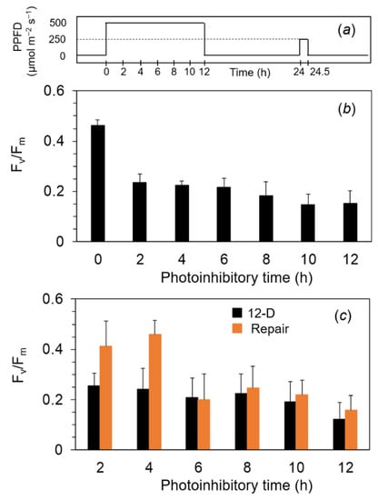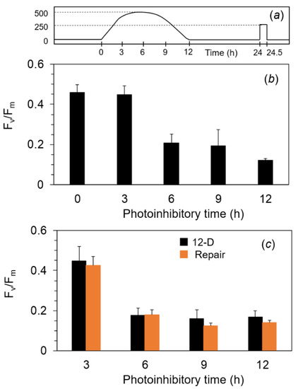 Next, we used a diurnal condition as the more realistic pattern. The filamentous cells were exposed to the simulated natural illumination for a 12 h light period in a day: The PPFD level increased gradually from 0 μmol m−2 s−1 to 500 μmol m−2 s−1 at 6 h and decreased gradually to 0 μmol m−2 s−1 at 12 h (Figure 5a). When the PPFD reached 250 μmol m−2 s−1 after 3 h from the onset, Fv/Fm was not decreased. At 6 h from the onset of the illumination, Fv/Fm markedly decreased to ca. 0.2 (Figure 5b). After 6 h from the onset of the illumination, the cells were exposed to the illumination at less than 500 μmol m−2 s−1 again. However, Fv/Fm remained consistently low until the end of the illumination. Even when treated with the repair light for 30 min, Fv/Fm in these photoinhibited cells did not recover (Figure 5c).