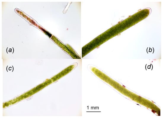 Filamentous cells of marimo used in Figure 6 with neutral red uptake assay. (a) Non-damaged cells incubated in the dark as a control. (b) Photoinhibited cells after five days of the high modulated light. (c) Cells treated with the repair light for 7 days after the high light for 5 days and (d) 14 days.