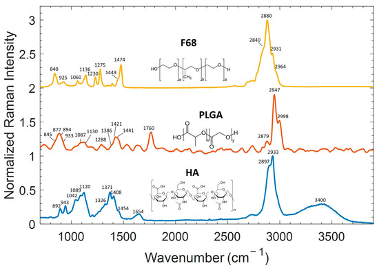 From the comparison of the Raman spectra of the three components, HA, PLGA, and F68, shown in Figure 1, a certain overlap between the bands is highlighted, especially for the vibrations involving CHn.