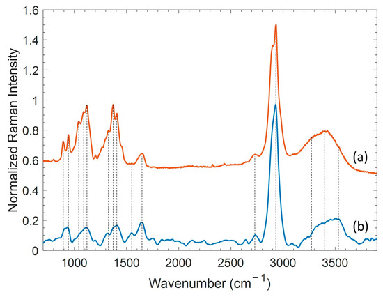 Except for a weak signal detectable in the region around ~2900 cm−1, the only observed bands correspond to the bending and stretching mode of the water molecule at 1640 and 3400 cm−1, respectively. This proves that SR fails at the considered concentration. The Raman response is different when SERS is used: Figure 3a, traces (ii) and (iii), report the average SERS spectrum of HA-coated and uncoated NPs acquired after the evaporation of a 20 µL droplet deposited upon a SERS substrate. It is also worth noting that the power used for SERS measurements was particularly low (P = 145 µW) and the exposure time quite short (τ = 2 s) in order to avoid possible photo-thermal damage.