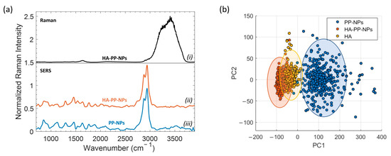 (a) Comparison of (i) Raman and SERS spectra of HA-PP-NP (ii) and PP-NP (iii) samples. The spectra were normalized and shifted; (b) score plot of PC1 versus PC2 for PP-NPs, HA-PP-NPs, and HA.