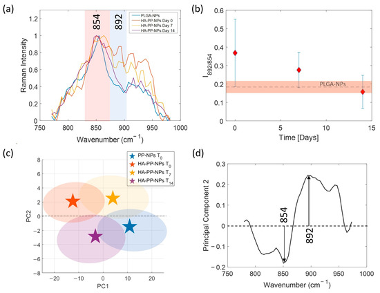 (a) Comparison of SERS spectra relative to PP-NPs T0 and HA-PP-NPs T0, T7, T14; (b) Plot of the ratio intensities I892/854 as a function of time. The ratio value relative to PP-NP T0 spectrum is reported as a dashed horizontal line and the corresponding error bar as a red box; (c) Score plot of PC1 versus PC2 for PP-NPs T0 and HA-PP-NPs T0, T7, T14; (d) Loading plot of PC2.