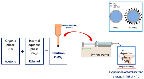 Processes of NP formulation are schematized in Figure 5. NPs were prepared using the nanoprecipitation technique followed by solvent evaporation, as previously described [42]. Briefly, for both formulations (PP-NPs and HA-PP-NPs) an organic phase (O) made up of PLGA, F68, and F127 (mass ratio 1:0.5:0.5; overall polymer concentration was 1.5% w/v) in 5 mL of acetone was prepared. Subsequently, 640 µL of ethanol (internal aqueous phase, W0) was added and W0/O emulsion was obtained by sonication (3000 sonicator, Misonix, Farmingdale, NY, USA; 5 min, 4W, 419 microtip probe). The emulsion was added dropwise, through a syringe pump at a volumetric flow rate of 333.3 μL/ min, to 40 ml of an external aqueous phase (W) containing F68 and F127 (0.0375 w/v each). In the case of HA-PP-NPs, 30 mg of HA 830 kDa was added to the W phase. Subsequently, acetone was evaporated for about 4 h under magnetic stirring. The resulting NP suspension was divided into 2 mL tubes and centrifuged three times (Hettich Zentrifugen, Tuttlingen Germany; 10,000 rpm, 10 min). After the first two centrifuges, 1 mL of supernatant was discarded and replaced with an equal volume of double-distilled water. After the last centrifuge, 1.5 mL of supernatant was removed, and 0.5 mL of PBS (sodium chloride, potassium chloride, and disodium phosphate) was added. The obtained formulation was filtered with 0.2 μm filters and stored at 4 °C.