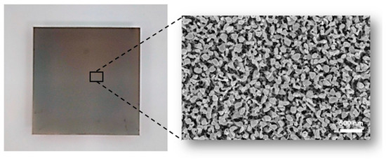 Digital photograph of SERS substrate fabricated on a 15 × 15 mm2 glass coverslip and SEM image of the nanostructured Ag film, exhibiting the typical coral-like morphology.