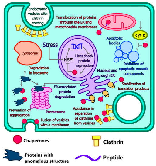 Molecular chaperones can be called the first line of defense against neurodegenerative diseases. They eliminate misfolded proteins, preventing their aggregation and the formation of amyloid structures [33,34,35]. Although the information necessary for peptide folding and formation of the correct tertiary structure is contained in the amino acid sequence, the probability of misfolding is quite high since there are many other molecules and molecular complexes inside the cell that can affect the correct folding. In addition to that, the protein may be initially predisposed to misfolding due to the presence of mutations that lead to errors in the amino acid sequence of the polypeptide chain, which causes the occurrence of hereditary forms of neurodegenerative disorders [36,37,38]. To protect against such errors during evolution, a specific chaperone system arose, aimed at combating misfolded proteins in all parts of the cell [32] (Figure 1). Normally, chaperones assist in the formation of functional tertiary structures of peptide chains after their synthesis on ribosomes. In addition, chaperones support the translocation of proteins through membranes of the endoplasmic reticulum and mitochondria. The role of chaperones in protein degradation consists of directing ubiquitinated proteins both from the endoplasmic reticulum and cytoplasm into proteasome-mediated degradation and mediating lysosomal degradation. Besides that, chaperones play key roles in system cellular processes, such as regulation of transcription factors during the heat stress response, clathrin coating dismantling, and the fusion of vesicles with cell membranes in exocytosis, and apoptosis. One of the main dangers associated with abnormal proteins is their ability to spread, affecting healthy proteins and changing their structure. In other words, they behave like typical prions. The studies carried out on yeast have not only helped to understand the nature of the prion distribution as such, but also the role of chaperones in their distribution. Although chaperones are supposed to rid the cell of misfolded proteins in the case of β-amyloid, they, on the contrary, contribute to their distribution. Experiments on yeast models have shown that chaperones fragment growing β-amyloid fibrils, which leads to an increase in the number of fibril growth centers and their further distribution [39].