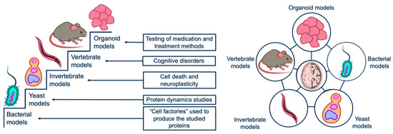 The approach to the treatment of any neurodegenerative disease involves three stages: diagnosis, actual treatment and further evaluation of its effectiveness. Each of these stages is important and can become an object of modeling. The time frame is no less important since the development of neurodegenerative pathologies can last for years and even decades. Thus, the development of Alzheimer’s disease takes an average of three years and Creutzfeldt-Jakob disease—within nine to ten years [17,18]. The disease may have a very long incubation period or be the result of many years of exposure to negative environmental factors such as heavy metal pollution [12]. Models of neurodegenerative diseases should, as far as possible, reproduce the corresponding time intervals between key events accompanying the development of neuropathology, without sacrificing the quality and accuracy of modeling. In addition, for animal models (especially those that replicate pathologies caused by inherited genetic defects) the rate of reproduction, generational change, and the lifespan of an individual is of importance.