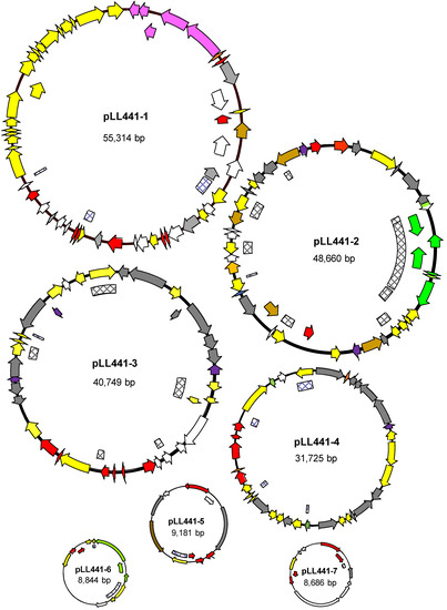 In previous work, genome sequencing of LL441 using Illumina short-read technology recorded 3,124,603 bp organized into 170 contigs [24]. Genome analysis identified 3017 genes, of which 2935 were predicted to be coding sequences. In the present work, LL441 was subjected to a new round of genome sequencing using long-read PacBio sequencing technology [37]. Thereupon, hybrid genome assembly of short- and long-read sequences provided the complete genome sequence of LL441, which consisted of eight circular contigs: one corresponding to the complete bacterial chromosome, plus seven different plasmids (pLL441-1 to pLL441-7).