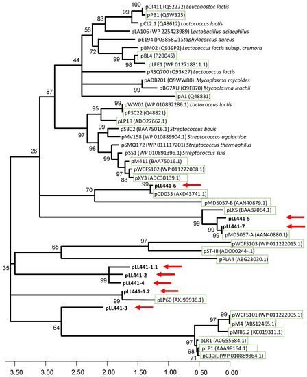 Dendrogram obtained with the distance matrix using the neighbor-joining method of the deduced amino acid sequences of RepB proteins from the seven plasmids of LL441 (pLL441-1 to pLL441-7) and those of other L. plantarum plasmids (boxed in green) and representative plasmid of different rolling-circle and theta-type plasmid families from other bacteria. Evolutionary distances were measured as the mean number of amino acid differences per site. The red arrows point toward the position of the L. plantarum LL441 plasmids.