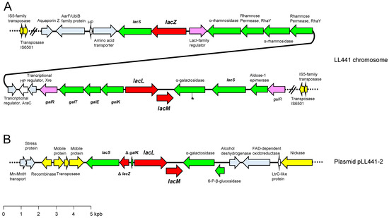 Genetic organization of the lactose gene clusters found in the chromosome (A) and plasmid pLL441-2 (B) of the L. plantarum LL441 genome. Colour code: in red, genes coding for β-galactosidases, lacZ, and lacLM; in green, genes for carbohydrate transport and metabolism systems; in light purple, genes encoding regulatory proteins; in yellow, open reading frames (ORFs) encoding transposases or mobilization proteins; in light blue, other genes; in white, genes encoding hypothetical proteins (HP). The asterisk in the chromosomal copy of the α-galactosidase ORF denotes a point mutation disrupting the gene. The rhaY and araC genes, linked by a black line, are contiguous in the chromosome. The dotted lines at the end of the clusters and the crossed lines indicate the continuity of the regions.