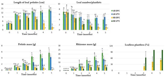 The effect of temperature (17 °C and 23 °C) and photoperiod (LD—long day, SD—short day) on ex vitro growth of micropropagated rhubarb ‘Raspberry’ plantlets after different growth periods (0, 1, 2, 3, 4 and 5 months) in the growth room. According to Duncan’s test (p = 0.05), the means marked with the same letter within each growth parameter do not differ significantly. Error bars represent standard deviation.