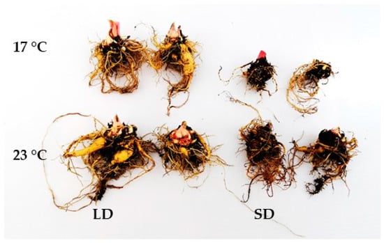 This study showed that micropropagated rhubarb ‘Raspberry’ plantlets are very sensitive to the photoperiod. The plantlets exposed to a 10-h photoperiod and a temperature within the normal growth range (17–23 °C) showed impaired growth of leaves and rhizomes, rapid leaf senescence and dormancy development. We did not evaluate the effect of low temperatures. Nonetheless, faster growth cessation and dormancy development at a temperature of 17 °C compared to 23 °C suggest the interaction of the photoperiod and temperature in dormancy induction in rhubarb plantlets. Similarly, in the dormancy model of plant leafy spurge, endodormancy was initiated by a decrease of the photoperiod and temperature []. Authors indicated that the changes occurring in controlled environments are similar to those under natural field conditions during the transition from summer to fall in the northern hemisphere [].