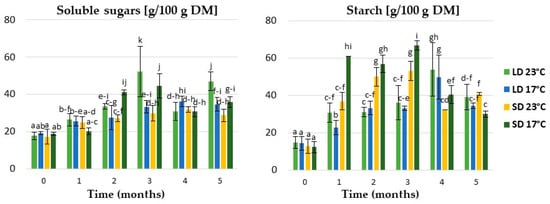 Variation in the content of soluble sugars and starch in rhubarb buds during five months of ex vitro growth under different temperatures (17 °C and 23 °C) and photoperiods (16 h and 10 h). According to Duncan’s test (p = 0.05), means marked with the same letter do not differ significantly (p = 0.05). Error bars represent standard deviation.