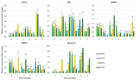 As shown in Figure 5, SD was an essential factor affecting sucrose synthase 3 (SUS3) expression levels. The relative expression of this gene was upregulated, reached the maximum value after four months of growing at 23 °C and 17 °C and was almost 9.2-fold and 8.8-fold higher, respectively, than in the control. In LD conditions, the expression of the SUS3 gene peaked over the third and fifth month of growth at 23 °C and at the end of the first month at 17 °C. The expression of the starch synthase 3 (SS3) gene was enhanced rapidly over the first month of growth in SD, decreased, and then peaked again over the third month (23 °C) and fourth month (17 °C). In contrast, LD conditions resulted in low SS3 levels at the beginning of growth ex vitro, and the highest expression levels were obtained at the end of the third month of growth at both temperatures. Among the starch amylase genes examined, α-amylase (AMY3) was drastically downregulated under a 16-h photoperiod and lower temperature. In turn, β-amylase 3 (BMY3) was downregulated under a 16-h photoperiod and 23 °C. The gene of β-glucosidase (BGLU17), related to carbohydrate transport, was upregulated by both photoperiod and temperature (Figure 5).
