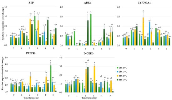 The relative expression of the genes involved in abscisic acid metabolism in rhubarb buds during ex vitro growth under different temperatures (17 °C and 23 °C) and photoperiods (16 h and 10 h). According to Duncan’s test (p = 0.05), means marked with the same letter do not differ significantly (p = 0.05). Error bars represent standard deviation.