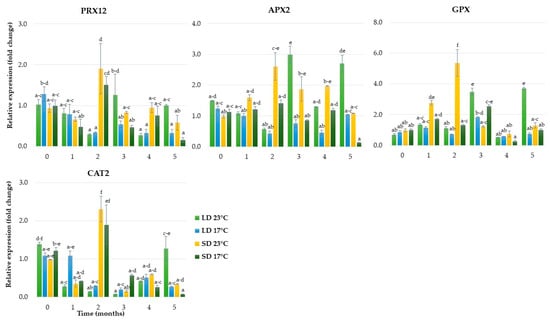 The relative expression of genes involved in antioxidant metabolism in rhubarb buds during five months of ex vitro growth under different temperatures (17 °C and 23 °C) and photoperiods (16 h and 10 h). According to Duncan’s test (p = 0.05), means marked with the same letter do not differ significantly (p = 0.05). Error bars represent standard deviation.