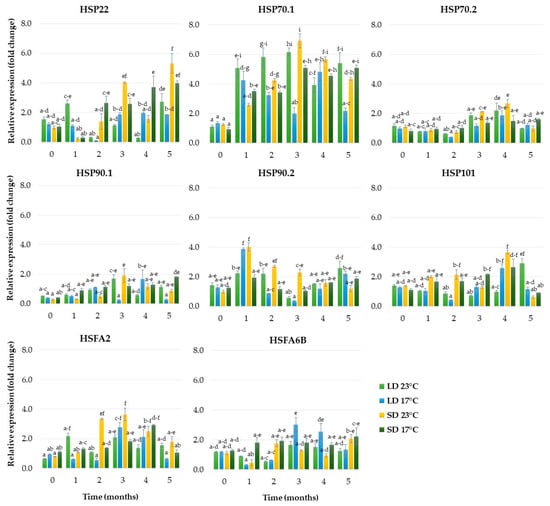 The relative expression of the genes encoding heat shock proteins and heat stress transcription factors in rhubarb buds during five months of ex vitro growth under different temperatures (17 °C and 23 °C) and photoperiods (16 h and 10 h). According to Duncan’s test (p = 0.05), means marked with the same letter do not differ significantly (p = 0.05). Error bars represent standard deviation.