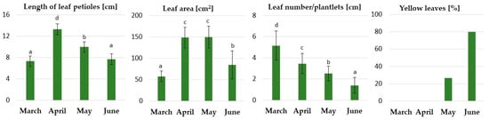 After the short adaptation period (1–2 weeks) to the greenhouse conditions, the rhubarb plantlets showed intensive growth of leaves and rhizomes (Figure 8). The highest increase in leaf petioles and blades was observed in April, at the end of the second month of growth in the greenhouse. However, the leaf number decreased. This resulted from the death of the oldest leaves developed in vitro. In May, when the maximum temperature increased to 28.9 °C (for four days), the growth rate slowed and leaf senescence was induced. A further increase in temperature in July resulted in a rapid increase in leaf senescence (Figure 9 and Figure 10) and dormancy development. At the end of June, most of the leaves (80%) were yellow.