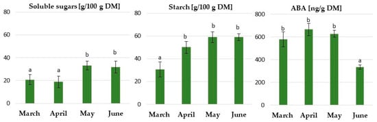 The rhubarb buds were frozen immediately after collection, and then lyophilized and homogenized. Then, bud samples (approximately 20 mg) were extracted with 1.5 mL of 80% aqueous ethanol and centrifuged at 833× g for 10 min. The amounts of total soluble sugars were estimated by the phenol–sulfuric method []. The supernatant was mixed with 5% phenol and 96% sulfuric acid. The absorbance (λ = 490 nm) of the samples was measured spectrophotometrically (Thermo Electron Corporation, Waltham, MA, USA, type Evolution 300 BB). The amounts of soluble sugars were determined against a glucose standard and expressed in grams per 100 g of dry mass (DM) plant tissue.