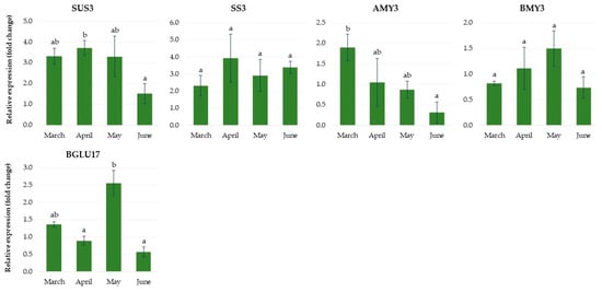 The relative expression of the genes involved in carbohydrate metabolism in rhubarb ‘Raspberry’ plantlets during ex vitro growth in the greenhouse from early March to the end of June. According to Duncan’s test (p = 0.05), means marked with the same letter do not differ significantly (p = 0.05). Error bars represent standard deviation.