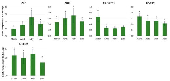 The relative expression of the genes involved in abscisic acid metabolism in rhubarb ‘Raspberry’ plantlets during ex vitro growth in the greenhouse from early March to the end of June. According to Duncan’s test (p = 0.05), means marked with the same letter do not differ significantly (p = 0.05). Error bars represent standard deviation.