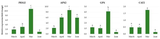 As shown in Figure 14, the expression levels of genes involved in the antioxidant reaction, such as peroxidase 12-like (PRX12), glutathione peroxidase (GPX) and catalase 2 (CAT2), were low in March and April in plantlets grown in the greenhouse, but increased rapidly in May, reaching maximum values being 11.0-, 4.0- and almost 2.0-fold higher than in the controls, respectively, and they then quickly decreased in June. The ascorbate peroxidase (APX2) gene was upregulated rapidly in April, remained at a high expression level until the end of May and then its level also decreased.