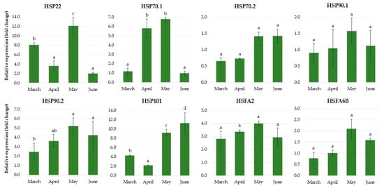The relative expression of the genes encoding the heat shock proteins and heat stress transcription factors in rhubarb ‘Raspberry’ plantlets during ex vitro growth in the greenhouse from early March to the end of June. According to Duncan’s test (p = 0.05), means marked with the same letter do not differ significantly (p = 0.05). Error bars represent standard deviation.