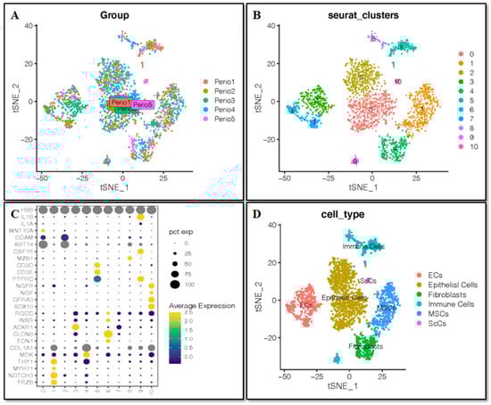 The GEO database was employed to obtain the single-cell sequencing data set GSE164157 of human teeth. Data quality control was then executed for a total of 5 samples comprising the data set. The following criteria were adopted in this analysis: cells with 10% or less expression of mitochondrial genes, cells with more than 200 genes expressed in at least three types of cells, and 200 to 7000 range of gene expression levels in at least three types of cells. Three thousand highly variable genes were selected. SCT correction [53] was applied to integrate the data. The “dims” parameter was set at 20, the data dimension was reduced using the tSNE method [54], and the clustering of cells was carried out at a resolution of 1.0 using the “KNN” method [55]. Thereafter, cells were characterized by several cell surface-specific markers.