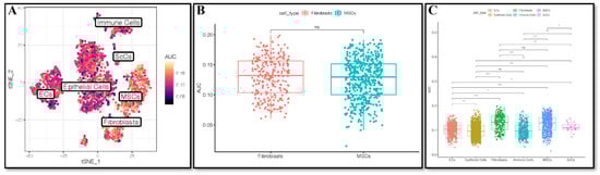 Activation of hypoxia in cell types. (A) Tsne diagram of the activation of hypoxia in cell types. (B) Activation of hypoxia in fibroblasts and MSCs. (C) Boxplots of the activation of hypoxia in cell types. * p < 0.05, ** p < 0.01, *** p < 0.001. ns, not significant.