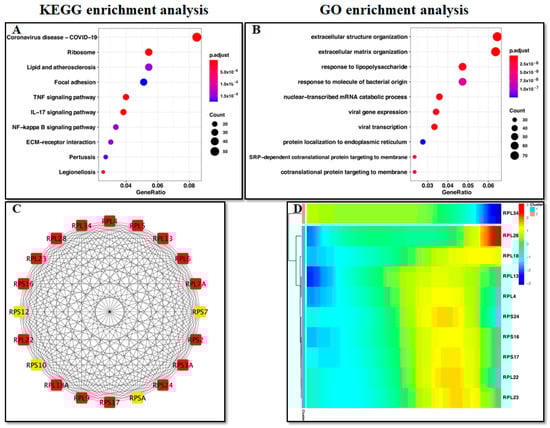 The genes in the blue and turquoise modules were mainly related with ribosomes and extracellular organization (Figure 4A,B). Analysis of protein–protein interactions revealed the top 20 DEGs (Figure 4C). As fibroblasts differentiate, among the top 10 DEGs, RPL34 gene expression gradually decreased, while expression of the other 9 ribosomal proteins increased (Figure 4D).