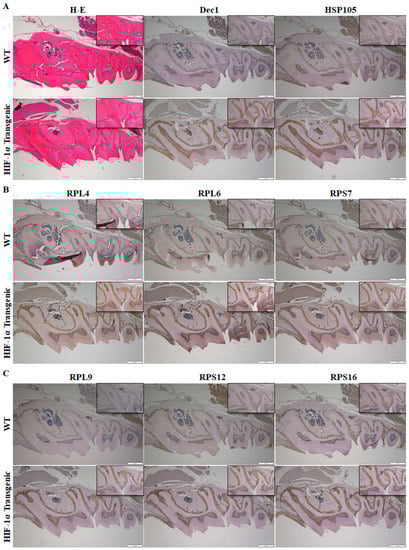 The distribution and localization of Dec1, HSP105, and ribosomal proteins were analyzed in HIF-1α transgenic mice. Histological analysis showed a similar morphology in WT mice and in HIF-1α transgenic mice (Figure 5A). The expression of Dec1, HSP105, RPL4, RPL6, RPS7, RPL9, RPS12, RPS16, and RPS24 was higher in PDL fibroblasts of HIF-1α transgenic mice compared to WT mice (Figure 5A–D).